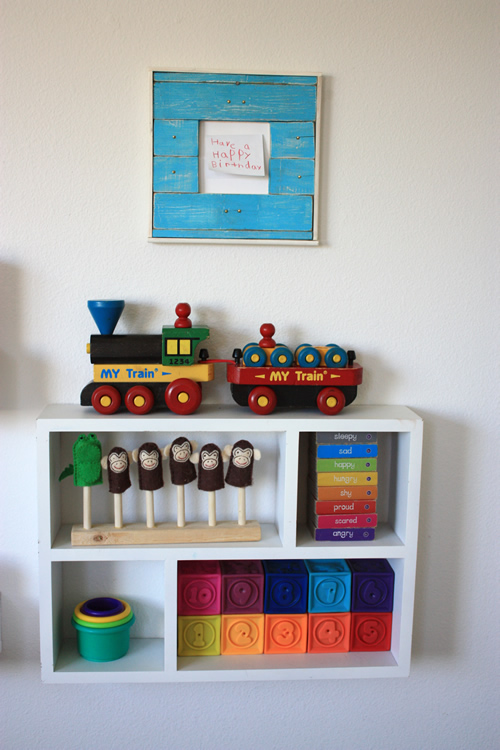 My main goal for the room was to have everything at Ray’s level, but high enough to make him want to get up and work those leg muscles so he can start walking (16 months and no sign of stepping). So there’s really no furniture in there for adults. I always find myself on the floor in his room, which is great because it forces me to interact with him on the floor, read to him while propped up against a wall and just be at his level.
