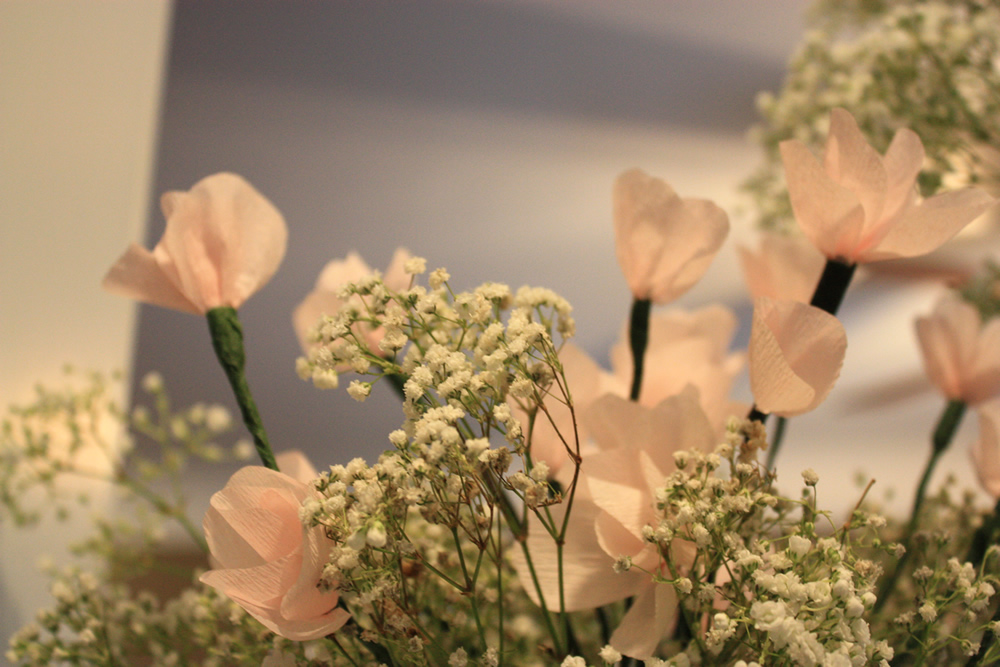 When you first walked into Leslie’s house we had these flowers – homemade pink crepe paper flowers with babies breath.
