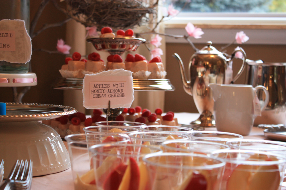 This was the food table and main attraction – I made the ruffled pink table cloth (thank you 40% off coupon to Joanns for 25 yards of fabric) and Les made the silver tree with flowers and birds and nest: