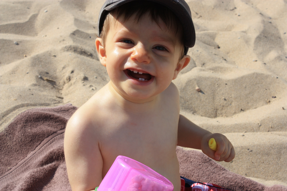 We tried putting Ray down by the water, but he just screamed. We let him scream and ruin everyone’s beach experience for a few minutes, then gave up when he never calmed down. He was terrified. It was a terrified scream. So sad. So we set him up right here on the towel with puffs to cram in his face. And that’s how Ray enjoyed the beach … the whole trip. He didn’t seem wild about the sand, or the water … yeah, so that’s really what the beach is, so I guess he doesn’t like the beach. He must not be my kid. I don’t get it.